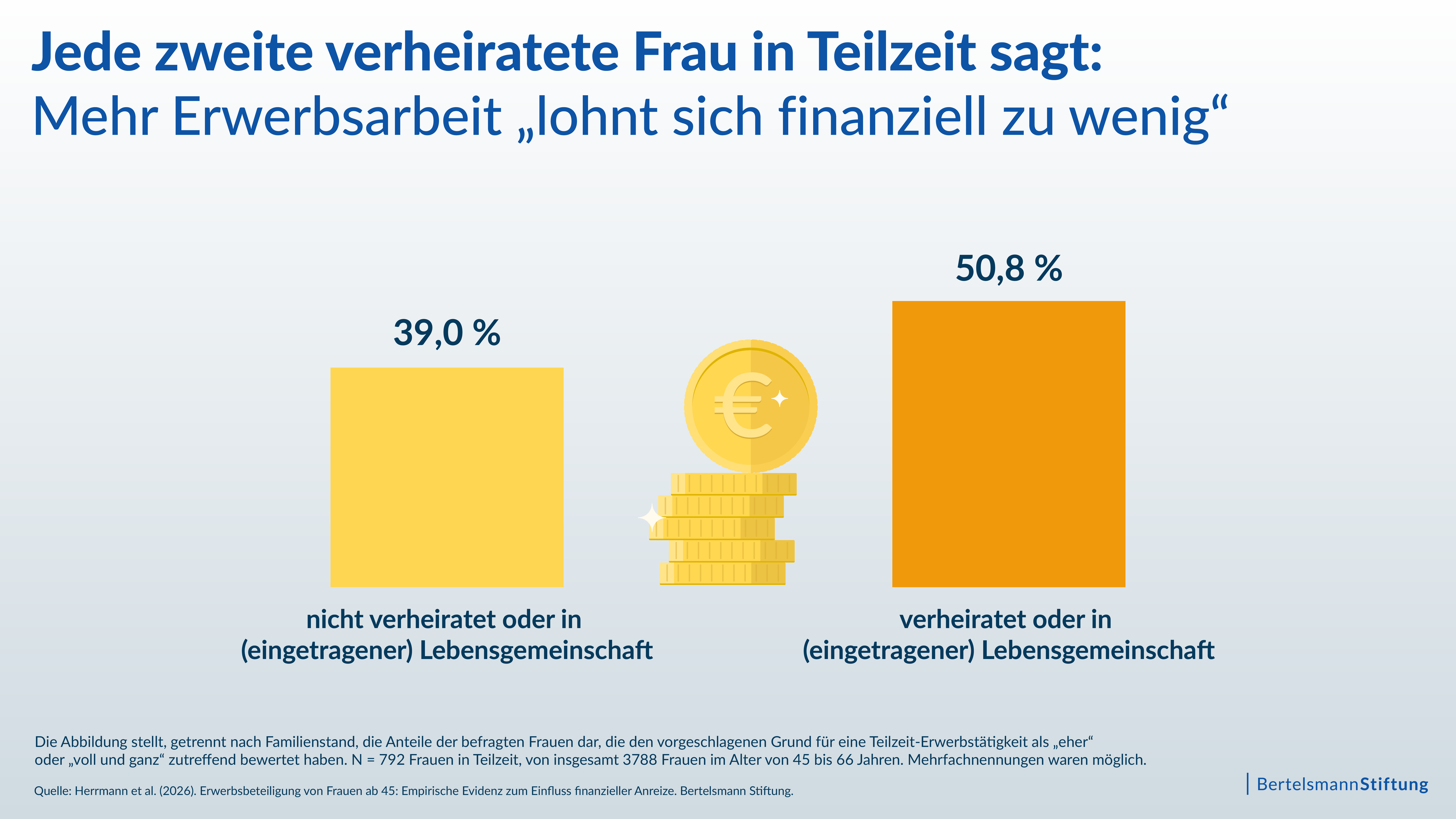 In der Studie „Erwerbsbeteiligung von Frauen ab 45“ untersuchen wir unter anderem die Gründe hinter diesem hohen Teilzeitanteil. Dafür haben wir in Zusammenarbeit mit dem Deutschen Institut für Wirtschaftsforschung (DIW) 3.788 Frauen im Alter von 45 bis 66 Jahren zu ihren Erwerbsentscheidungen und -präferenzen befragt. Das Ergebnis: Über 50 Prozent der verheirateten Frauen in Teilzeitbeschäftigung geben an, dass sich eine Erhöhung der Erwerbsarbeitszeit finanziell nicht für sie lohnen würde. Bei den unverheirateten teilzeitbeschäftigten Frauen sind es 39 Prozent.