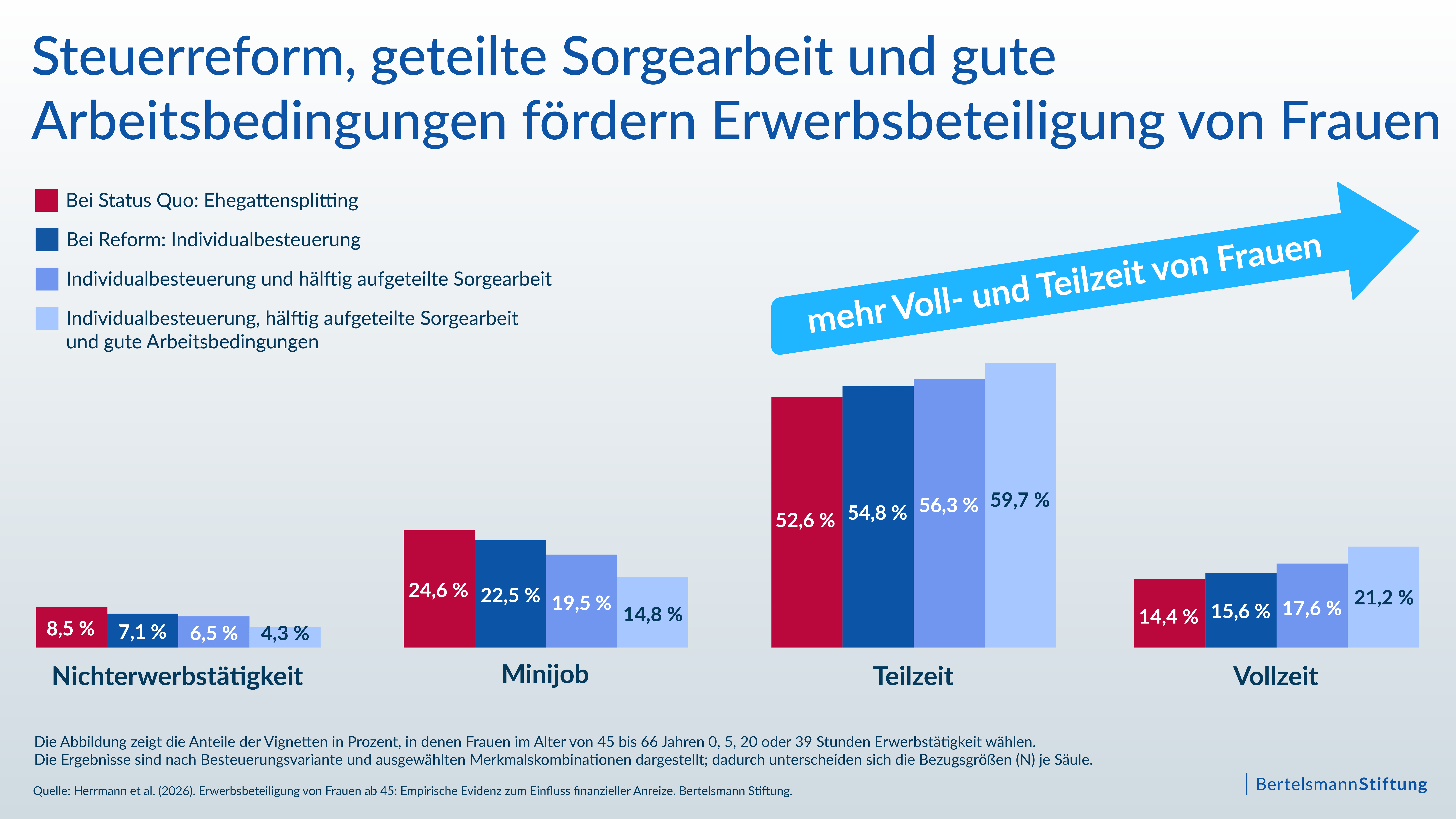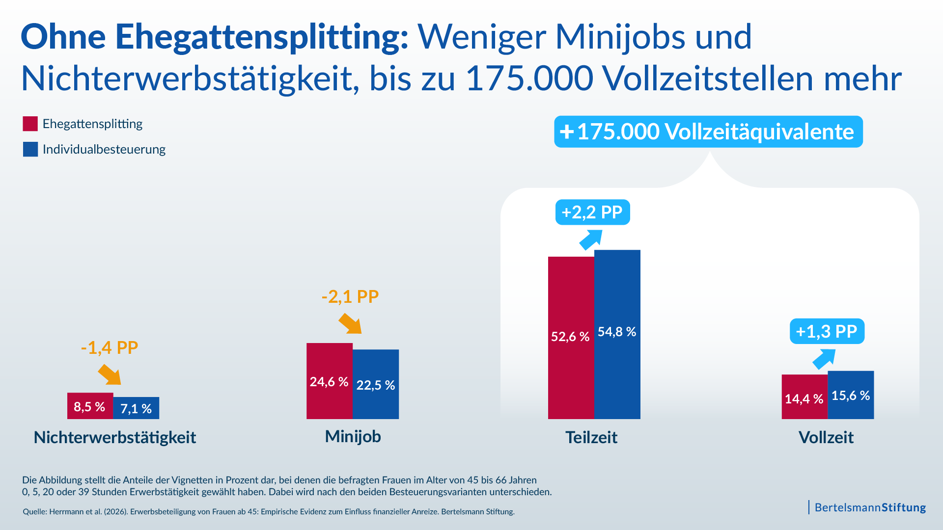 In unserer Studie vergleichen wir den Status Quo des Ehegattensplittings mit dem Alternativszenario der Individualbesteuerung. In einem Vignettenexperiment wird den Befragten die Situation einer 47-jährigen Frau beschrieben, aus deren Sicht sie sich für eine bestimmte Erwerbstätigkeit (Vollzeit, Teilzeit, Minijob oder keine Erwerbstätigkeit) entscheiden sollen. Die familiären und beruflichen Komponenten der Situation, beispielsweise die Aufteilung von Sorgearbeit im Haushalt oder die Arbeitsbedingungen, werden variiert und randomisiert an die Befragten ausgespielt. Die Berechnung des Nettohaushaltseinkommens erfolgt daraufhin in einem Szenario nach den Regeln des Ehegattensplittings, und im anderen Szenario nach getrennter Veranlagung. Das Entscheidungsverhalten der Befragten zeigt: Ohne Ehegattensplitting wählen weniger Frauen die Nichterwerbstätigkeit oder einen Minijob, sondern stattdessen eher Teil- oder sogar Vollzeiterwerbstätigkeit. Rechnet man diese Entscheidungen auf die gesamte Bevölkerung hoch, bedeutet das ein potenzielles Mehr von bis zu 175.000 Vollzeitäquivalenten.